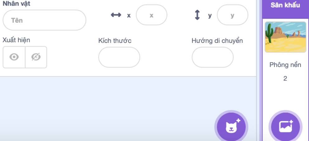 Tạo phông nền là bước đầu tiên trong quá trình thiết lập game bắn súng trên Scratch. Với trò chơi này, bạn có thể chọn phông nền tùy theo sở thích hay ý tưởng. Trong đó, “Desert” là gợi ý để bạn tham khảo. Trường hợp không dùng phông nền sẵn có, bạn hãy tải về ở phần “Tải phông nền” và “Tải nhân vật lên”.