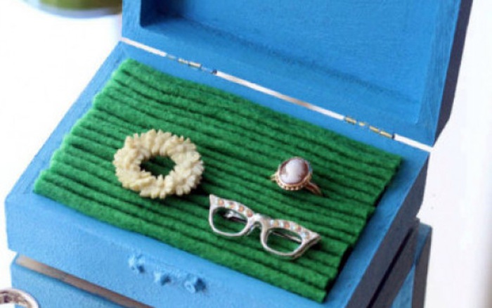 - Bước 3: Dùng một miếng vải màu khác phủ lên cuốn khăn vừa làm rồi ngăn giữa chúng với nhau bằng que tăm là bạn đã hoàn thành hộp đựng khuyên tai.