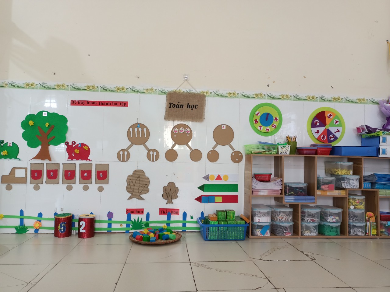 Toán học với lứa tuổi mầm non thường là những con số, hình học. Khi trang trí góc STEAM mầm non này cần tạo màu sắc tươi sáng, bắt mắt. Có thể cắt dán các số tương ứng với hình ảnh những con vật đáng yêu, gần gũi với bé.
