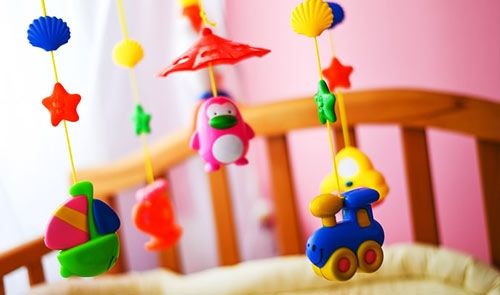 Chọn đồ chơi treo nôi có màu sắc bắt mắt và tốt nhất là có âm thanh vui tai để thu hút bé.