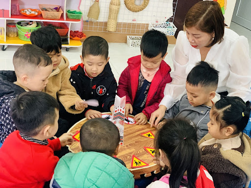 Thầy cô chia trẻ thành các nhóm để quá trình thực hành được hiệu quả và phát huy tối đa khả năng tư duy của các em. Sau đó, để trẻ tự đi lấy các vật dụng cần thiết để phục vụ cho hoạt động “làm biển báo giao thông”.