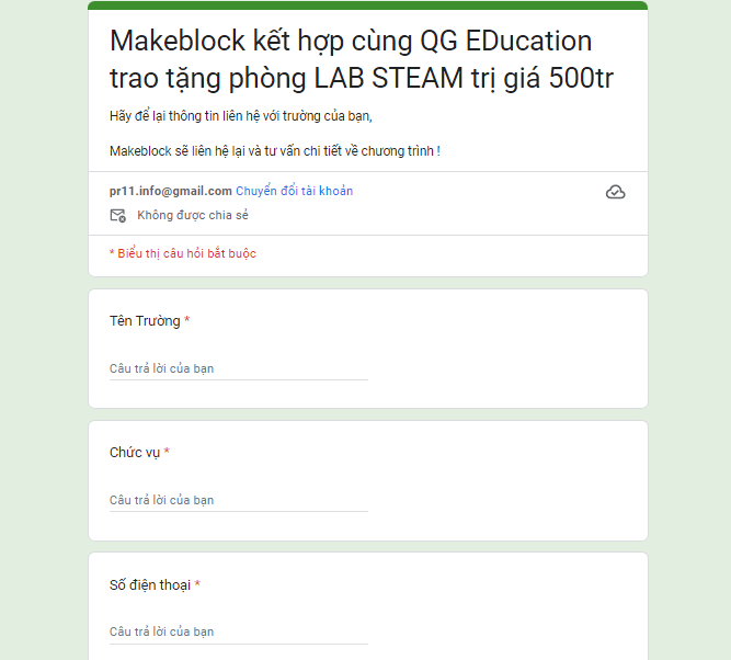Nếu như trường bạn đang muốn nhận trao tặng phòng LAB STEAM trị giá 500tr cho 100 điểm trường của Makeblock. Hãy điền đầy đủ thông tin vào form dưới đây để nhận được tư vấn chi tiết và nhanh nhất: https://forms.gle/33gYZTQjjkkFdSYaA hoặc liên hệ ngay với chúng tôi qua số hotline: 0983325500