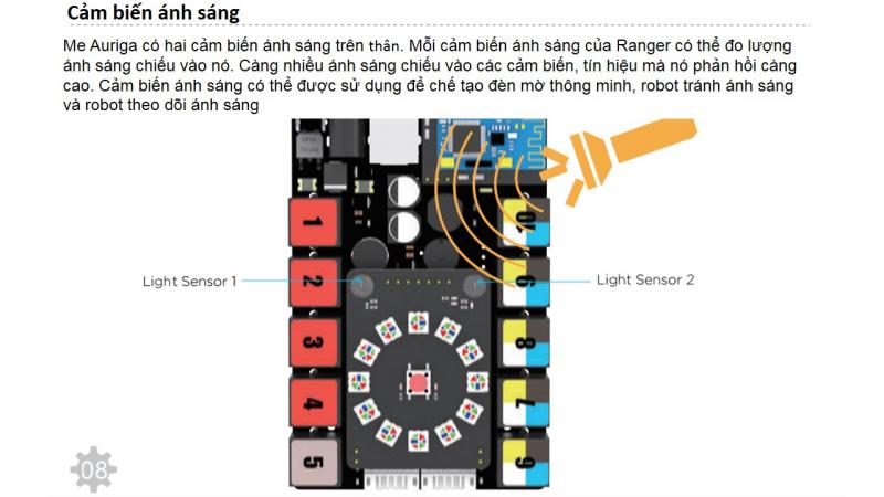 mBot Ranger được tích hợp 2 cảm biến ánh sáng trên thân. Mỗi cảm biến sẽ thực hiện đo lượng ánh sáng chiếu vào nó, số lượng ánh sáng càng nhiều thì tín hiệu phản hồi của cảm biến càng cao và ngược lại. Qua đó, chúng có thể được dùng để chế tạo robot tránh ánh sáng, robot theo dõi ánh sáng và đèn mờ thông minh.