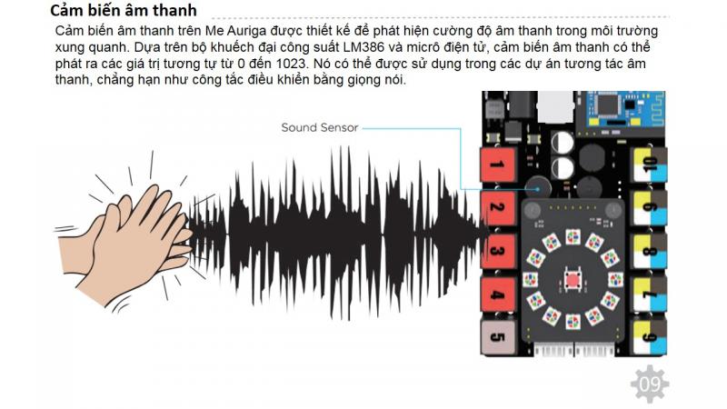 Cảm biến âm thanh được lắp đặt với mục đích phát hiện cường độ âm thanh trong môi trường xung quanh. Thông qua micro điện tử và bộ khuếch đại công suất LM386 mà cảm biến âm thanh dễ dàng nhận ra các giá trị tương tự từ 0-1023. Ứng dụng này rất hữu ích trong các dự án tương tác âm thanh chất lượng cao.