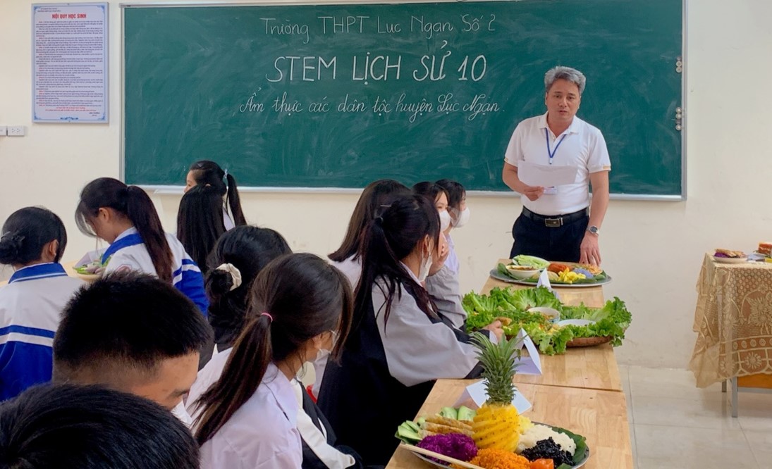 Các em học sinh lớp: 10A6, 10A8, 10A9, 10A10 tại THPT Lục Ngạn số 2 được tự tay chế biến các món ăn cổ truyền của địa phương vào những dịp quan trọng. Sau khi hoàn thành xôi ngũ sắc, nem rán, giò lụa, bánh trôi nước… các em sẽ thuyết trình để thể hiện tài năng của mình. Bài học phát huy khả năng làm việc theo nhóm giúp các em tự tạo ra ý tưởng và vận dụng giữa lịch sử với thực tế.