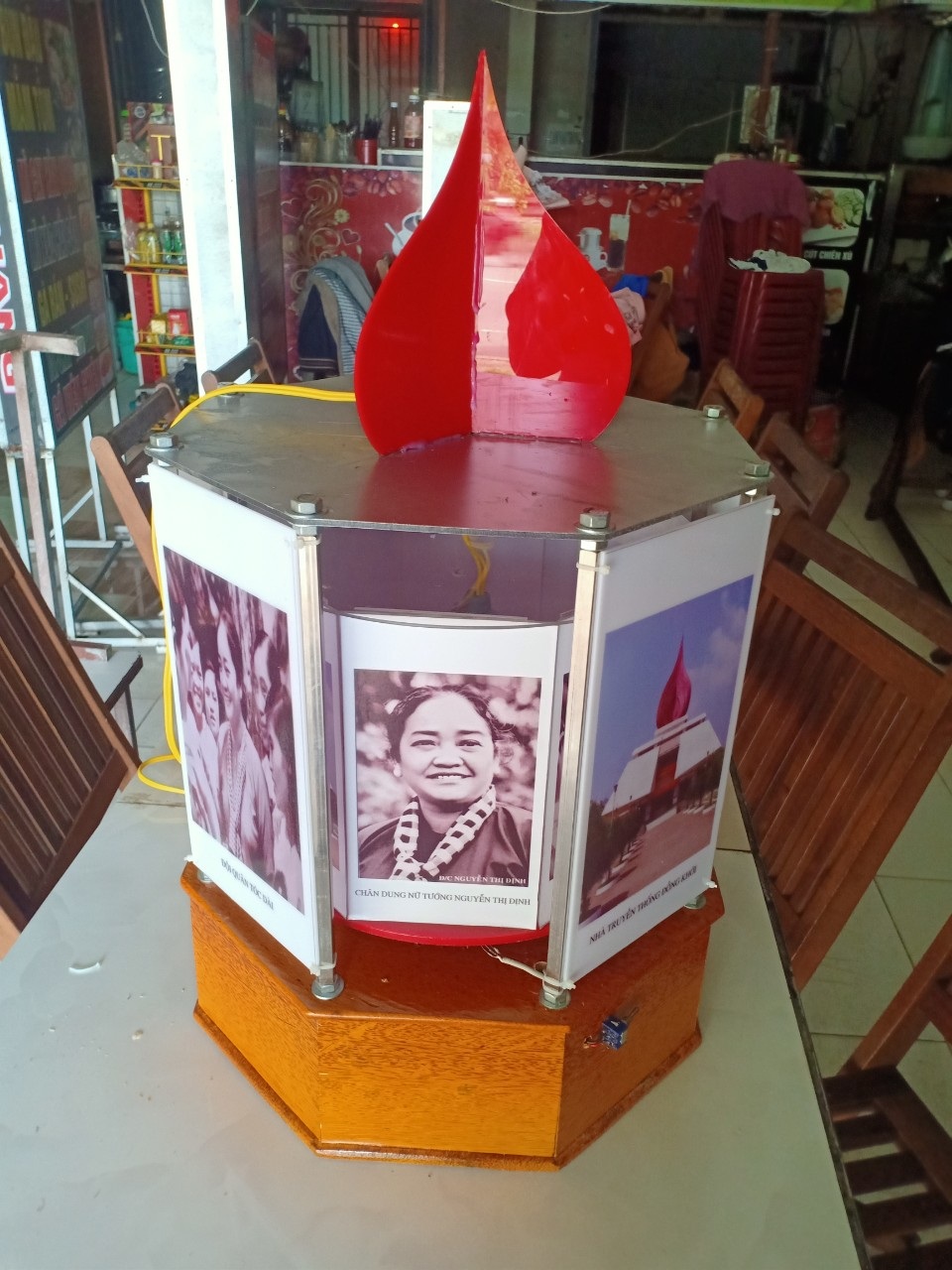 Mô hình được nghiên cứu và chế tạo của một số học sinh học trường THPT Chê Ghê va ra, THPT Quản Trọng Hoàng và THCS thị trấn Mỏ Cày. Sản phẩm gồm các bộ phận như: Lập trình cho mạch điều khiển, vị trí gắn đèn, mô hình, linh kiện… Thông qua mô hình, các em sẽ giới thiệu đến mọi người phong trào đồng khởi Bến Tre và lịch sử hào hùng của ông cha ta thời kháng chiến.