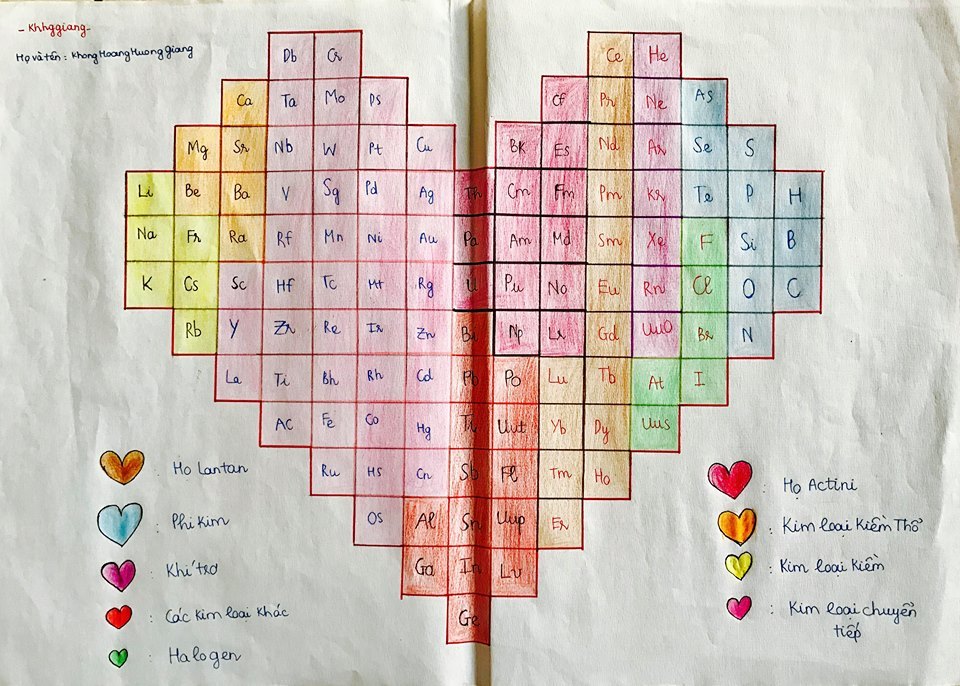 Theo thiết kế hình trái tim, các nguyên tố được sắp xếp vào mỗi ô vuông và tô màu đậm nhạt riêng biệt. Mục tiêu là làm nổi bật lên sự khác biệt giữa các nhóm chất, giúp học sinh nhận biết dễ dàng hơn.