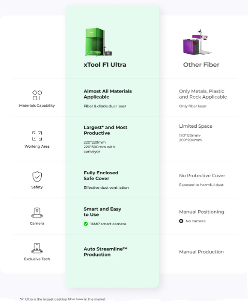 - Laser kép 20W Fiber & 20W Diode đầu tiên trên thế giới: Chúng tôi kết hợp khả năng của hai loại laser trong F1 Ultra: laser sợi quang cho hiệu suất khắc kim loại vượt trội và laser diode xanh để khắc các vật liệu thông dụng nhất.