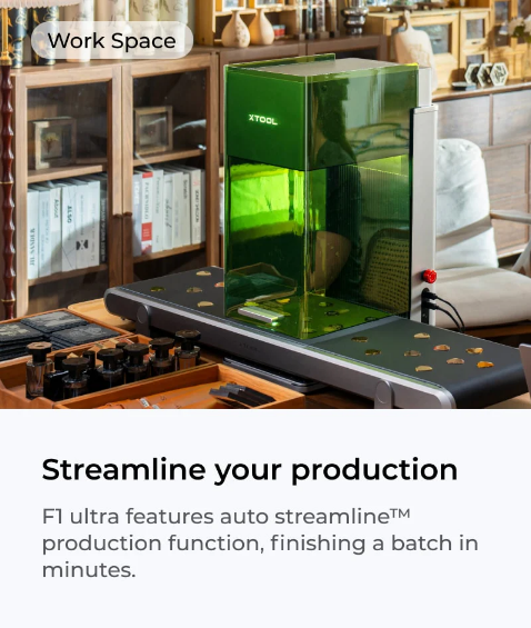 F1 Ultra:Khắc hàng loạt hiệu quả nhất trên hầu hết mọi vật liệu: F1 Ultra có cả Fiber 20W và Diode Laser 20W với tốc độ siêu nhanh 10000mm/giây, diện tích khắc 220*220mm và sản xuất tự động hợp lý hóa™